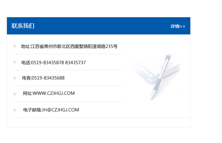 傳真:0519-83435688    郵編:213135    網址:WWW.czjhgj_com.zjzlwl.com    電子郵箱:JH@czjhgj_com.zjzlwl.com